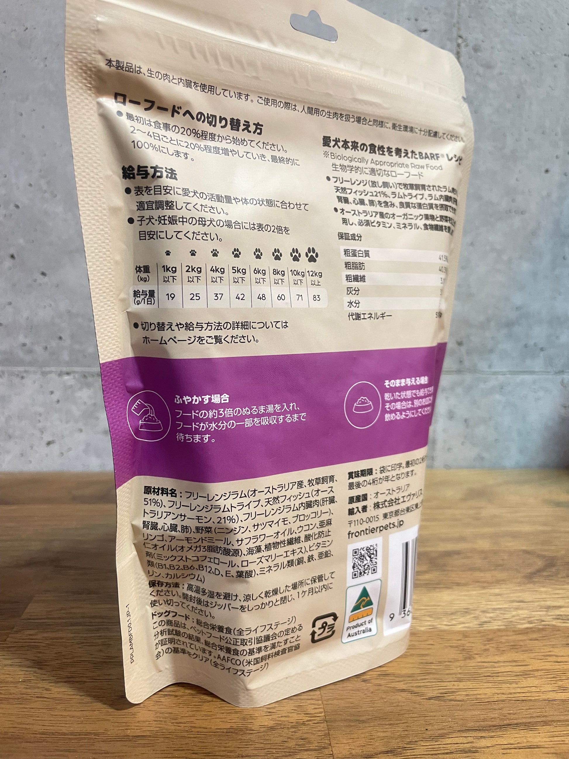 フリーレンジラム(オーストラリア産、牧草飼育、51%)、フリーレンジラムトライプ、天然フィッシュ(オーストラリアンサーモン、21%)、フリーレンジラム内臓肉(肝臓、腎臓、心臓、肺)、野菜(ニンジン、サツマイモ、ブロッコリー)、リンゴ、アーモンドミール、サフラワーオイル、ウコン、亜麻仁オイル(オメガ3脂肪酸源)、海藻、植物性繊維、酸化防止剤(ミックストコフェロール、ローズマリーエキス)、ビタミン類(B1、B2、B6、B12、D、E、葉酸)、ミネラル類(銅、鉄、亜鉛、リン、カルシウム)
