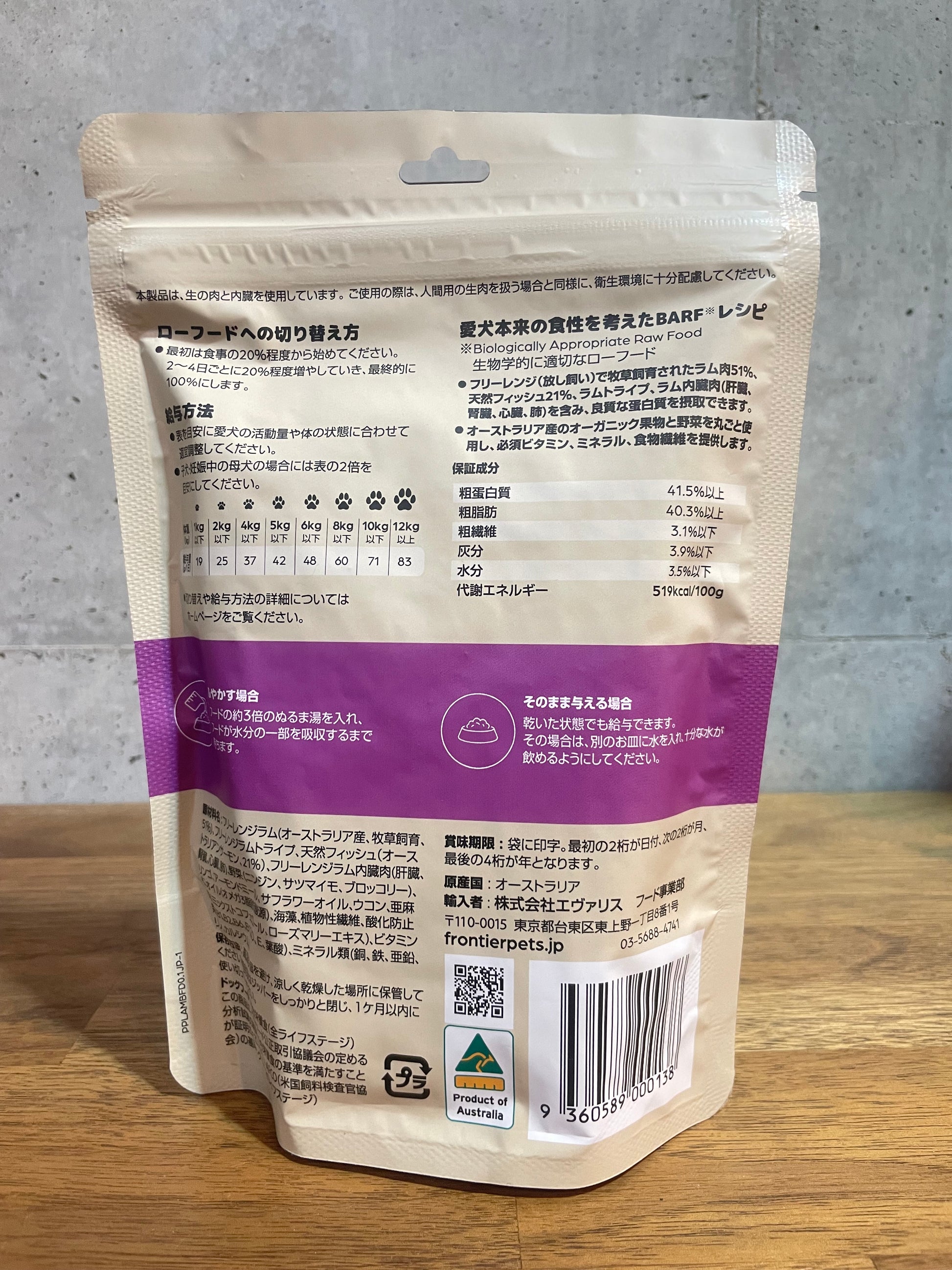 草食動物を丸ごと食べていた野生のオオカミの食事が犬にとっても理想の食事である」愛犬本来の食性を考えたBARFレシピ(生物学的に適切なローフード)に基づき、開発されました。消化酵素やビタミン、ミネラル、必須脂肪酸(オメガ3脂肪酸/オメガ6脂肪酸)やプロバイオティクス(善玉菌)など、生肉や内臓にもともと含まれている栄養素が加熱加工処理によって失われないように加熱せずに加工を最小限に抑えたフリーズドライ製法を採用。オーストラリアの恵まれた自然の中で育ったラムと天然魚、オーガニック野菜、フルーツなど安心安全な原材料を厳選し、生のままだからこそ得られる豊富な栄養とおいしさを実現しました。ドライフードに比べて長期間の保存が可能で軽くて持ち運びが便利なため、非常時の保存食としてもご活用いただけます。