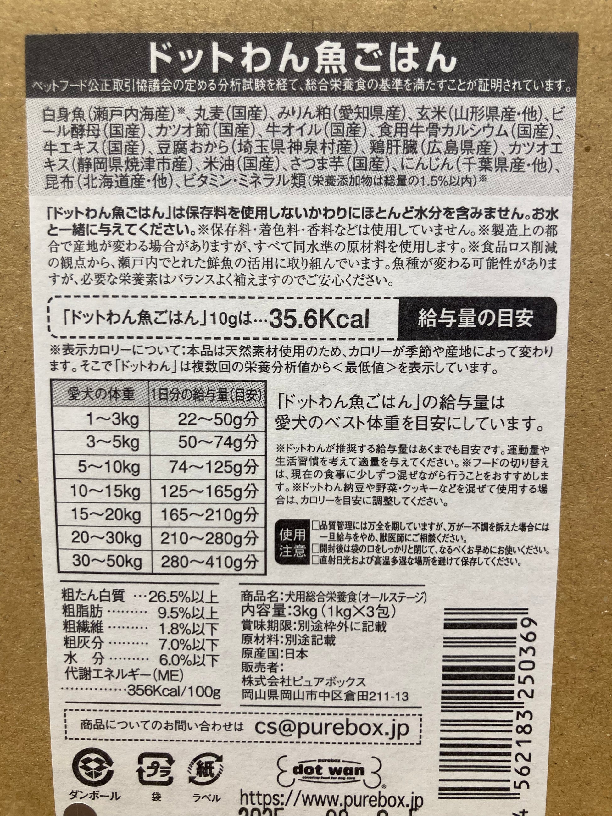 白身魚(瀬戸内海産)、丸麦(国産)、みりん粕(愛知県産)、玄米(山形県産・他)、ビール酵母(国産)、カツオ節(国産)、牛オイル(国産)、食用牛骨カルシウム(国産)、牛エキス(国産)、豆腐おから(埼玉県神泉村産)、鶏肝臓(広島県産)、カツオエキス(静岡県焼津市産)、米油(国産)、さつま芋(国産)、にんじん(千葉県産・他)、昆布(北海道産・他)、ビタミン・ミネラル類(栄養添加物は総量の1.5%以内)※塩化カリウム、グルコン酸亜鉛、ピロリン酸第二鉄、ビタミンE、ビタミンB12,グルコン酸銅、ビタミンA、パントテン酸カルシウム、ビタミンD、ビタミンB2内容量