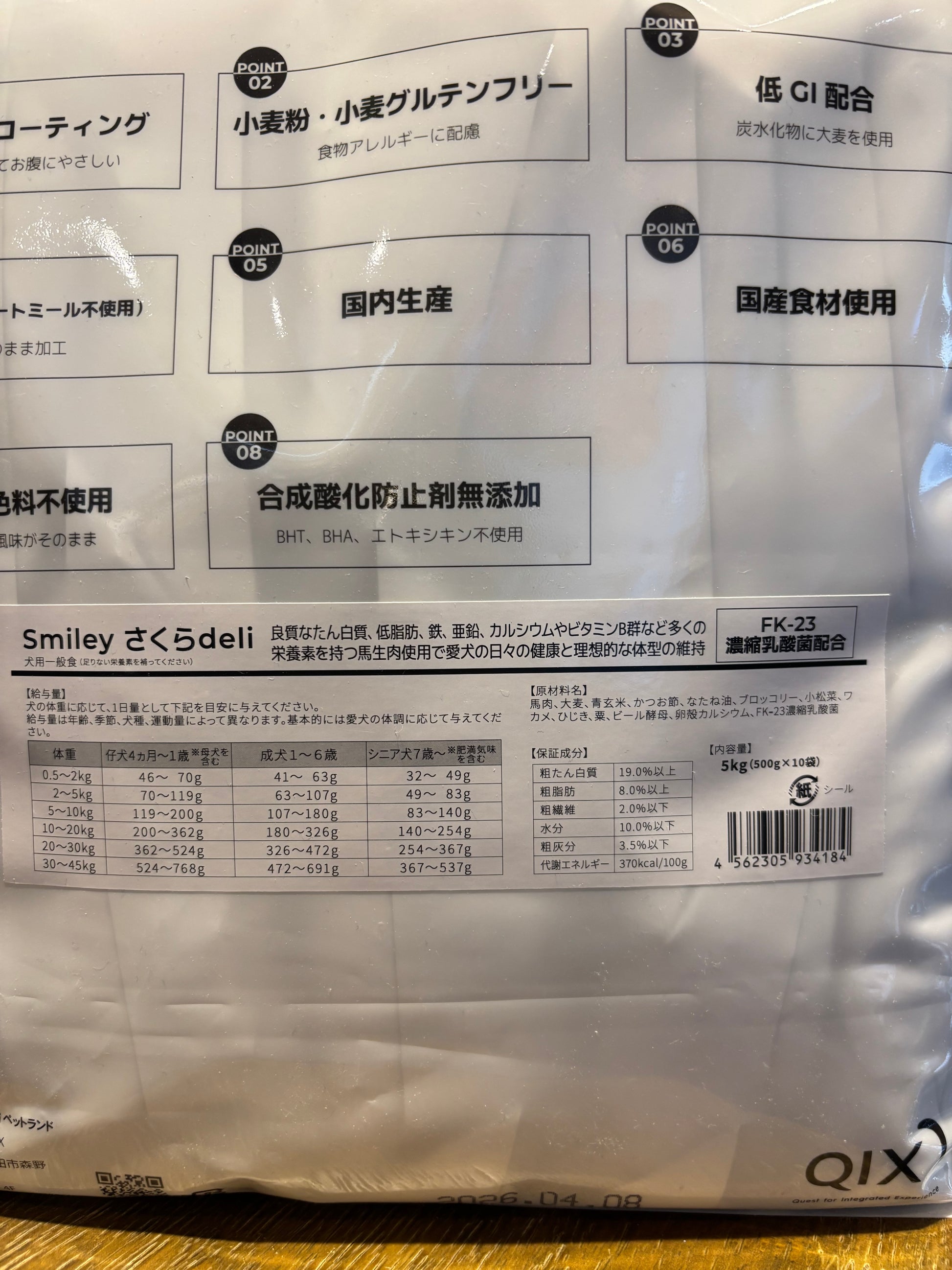 原材料:馬肉、大麦、青玄米、かつお節、なたね油、ブロッコリー、小松菜、ワカメ、ひじき、粟、ビール酵母、卵殻カルシウム、FK-23濃縮乳酸菌