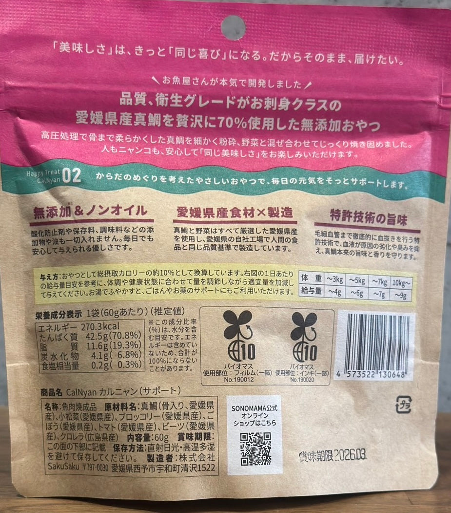 高圧処理で骨まで柔らかくした真鯛を丁寧に粉砕し、安心の愛媛県産野菜やクロレラと合わせてじっくり焼き固めました。