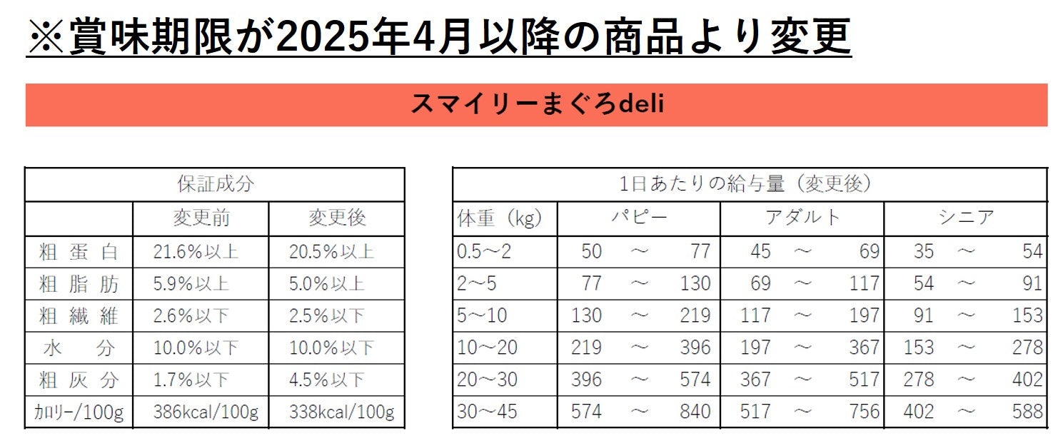 ・上記の給与量表はあくまで目安です。量は年齢、体重、犬種、運動量、環境によって異なります。基本的には愛犬の体調に応じて与えてください。