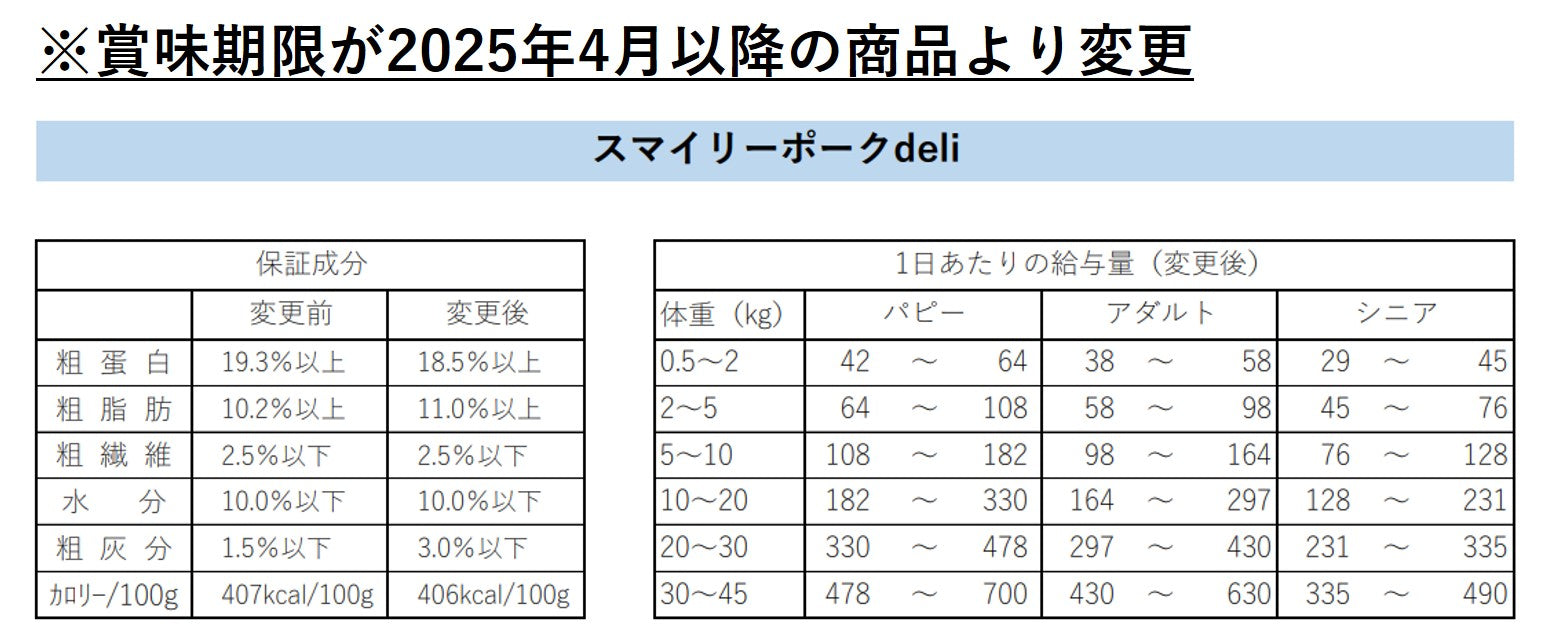 ・上記の給与量表はあくまで目安です。量は年齢、体重、犬種、運動量、環境によって異なります。基本的には愛犬の体調に応じて与えてください。