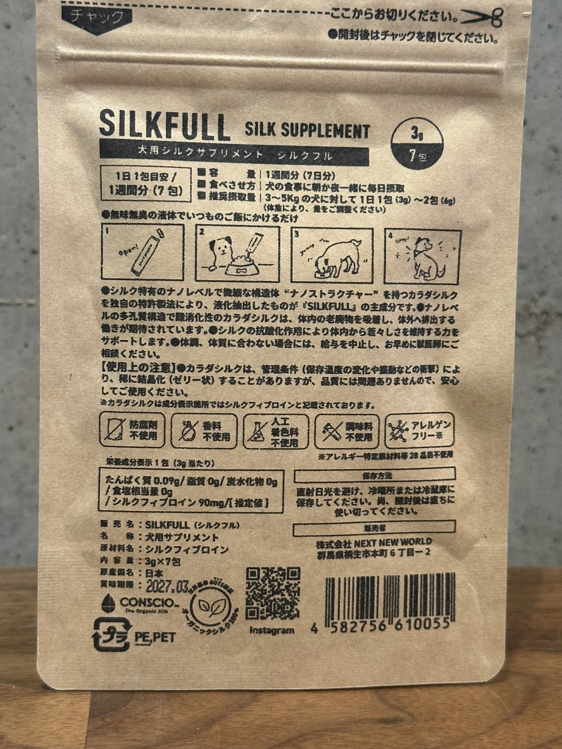 栄養成分(3gあたり):たんぱく質0.09g、脂質0g、炭水化物0g、食塩相当量0g、シルクフィブロイン90mg(推定値)