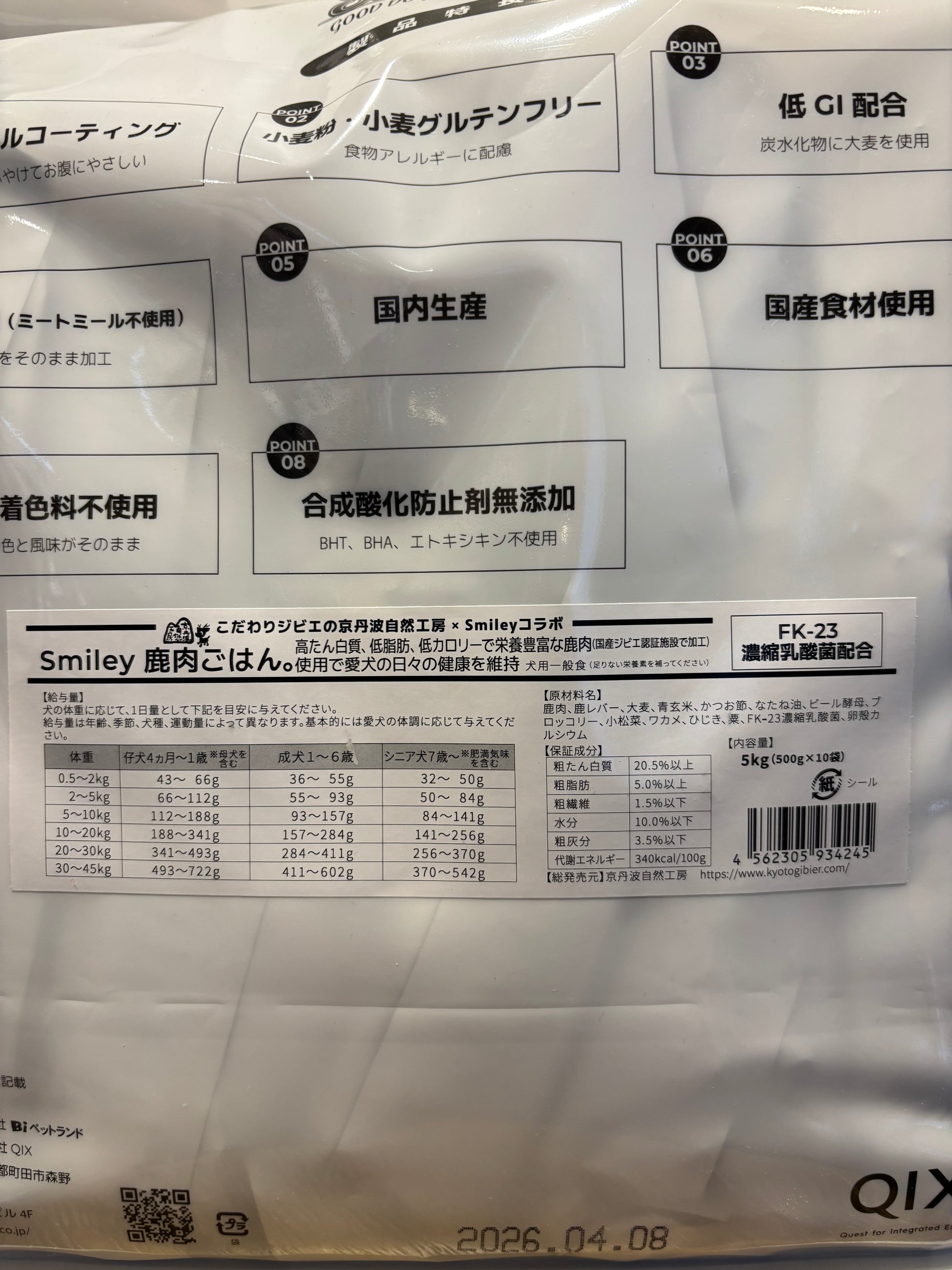 原材料:鹿肉、鹿レバー、大麦、青玄米、かつお節、なたね油、ビール酵母、ブロッコリー、小松菜、ワカメ、ひじき、粟、FK-23濃縮乳酸菌、卵殻カルシウム