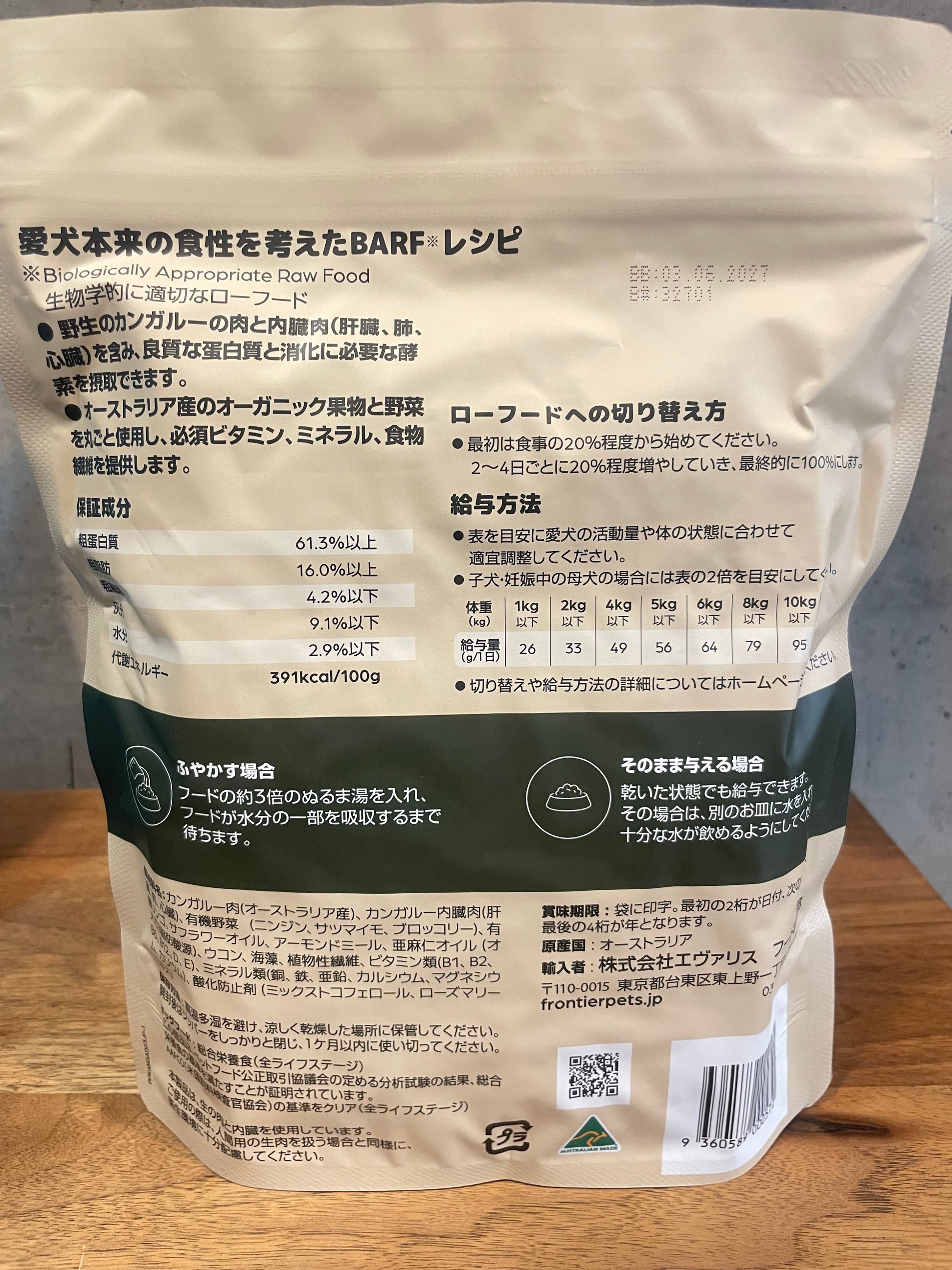 草食動物を丸ごと食べていた野生のオオカミの食事が犬にとっても理想の食事である」愛犬本来の食性を考えたBARFレシピ(生物学的に適切なローフード)に基づき、開発されました。消化酵素やビタミン、ミネラル、必須脂肪酸(オメガ3脂肪酸/オメガ6脂肪酸)やプロバイオティクス(善玉菌)など、生肉や内臓にもともと含まれている栄養素が加熱加工処理によって失われないように加熱せずに加工を最小限に抑えたフリーズドライ製法を採用。オーストラリアの恵まれた自然の中で生活していた野生のカンガルーとオーガニック野菜、フルーツなど安心安全な原材料を厳選し、良質な蛋白質と同時に消化に必要な酵素が生のままだからこそ得られます。ドライフードに比べて長期間の保存が可能で軽くて持ち運びが便利なため、非常時の保存食としてもご活用いただけます。