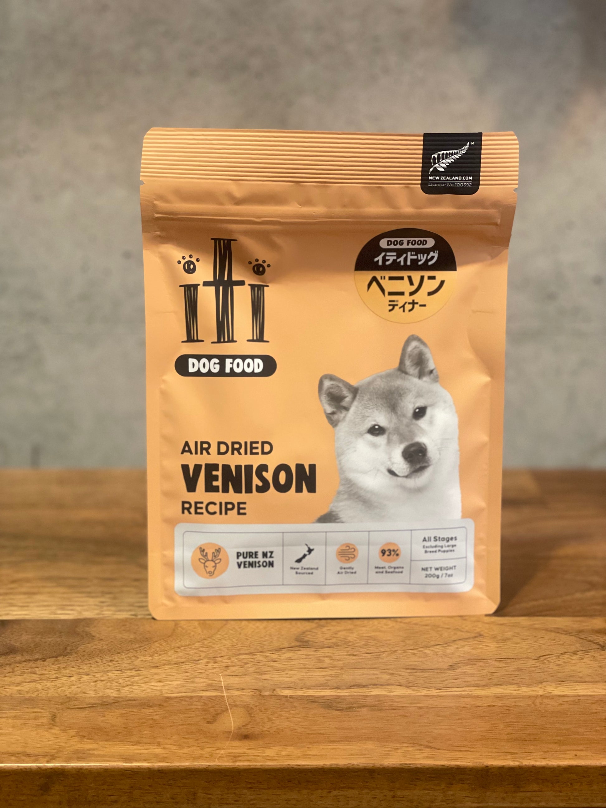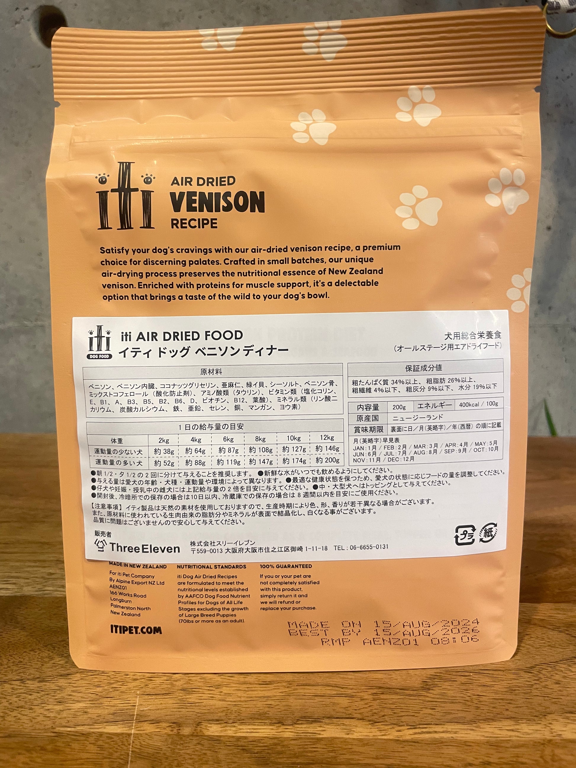 原材料:ベニソン、ベニソン内臓、ココナッツグリセリン、亜麻仁、緑イ貝、シーソルト、ベニソン骨、ミックストコフェロール(酸化防止剤)、アミノ酸類(タウリン)、ビタミン類(塩化コリン、E、B1、A、B3、B5、B2、B6、D、ビオチン、B12、葉酸)、ミネラル類(リン酸二カリウム、炭酸カルシウム、鉄、亜鉛、セレン、銅、マンガン、ヨウ素)