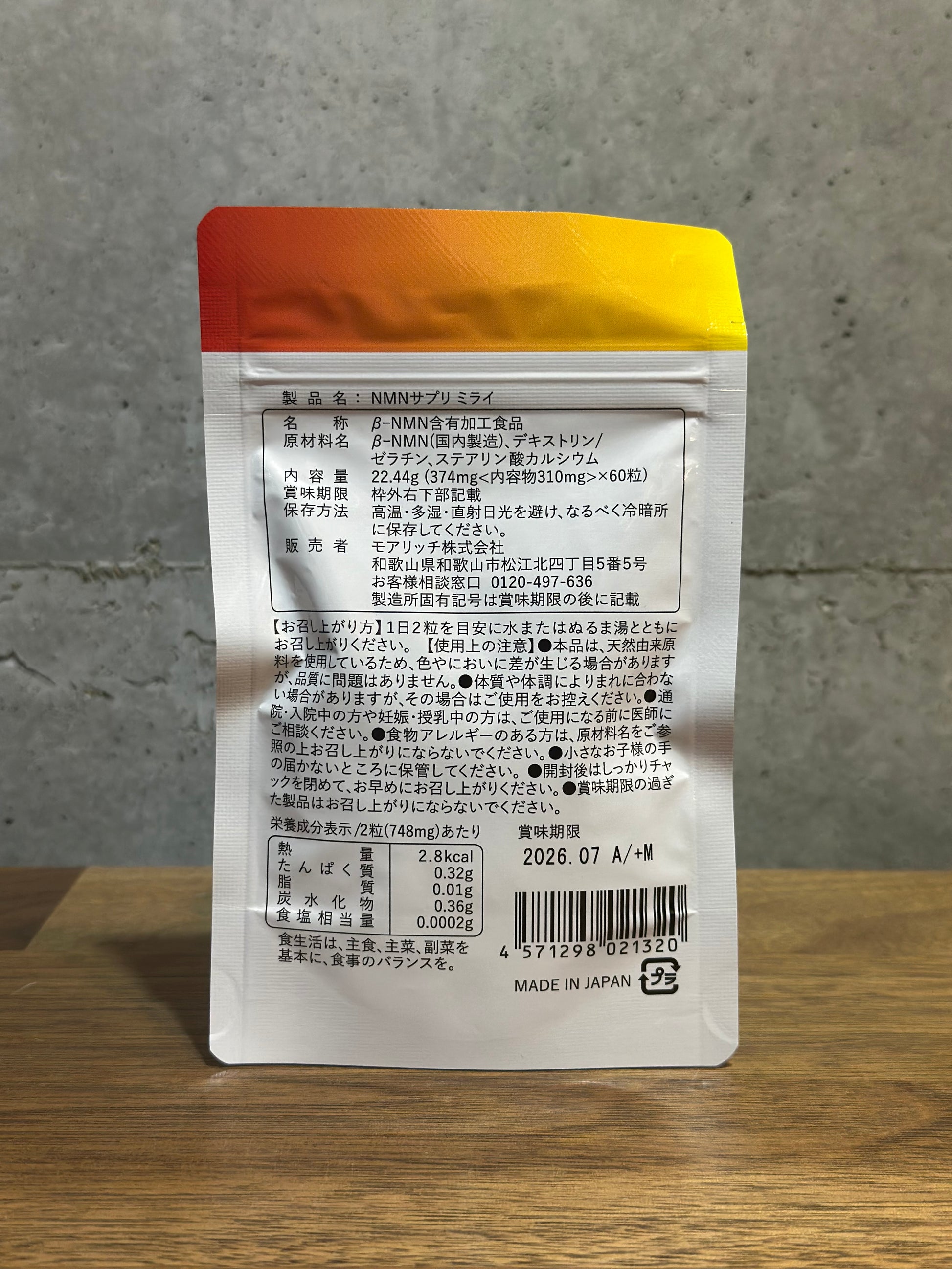 原材料:β‐NMN(国内製造)、デキストリン、ゼラチン、ステアリン酸カルシウム