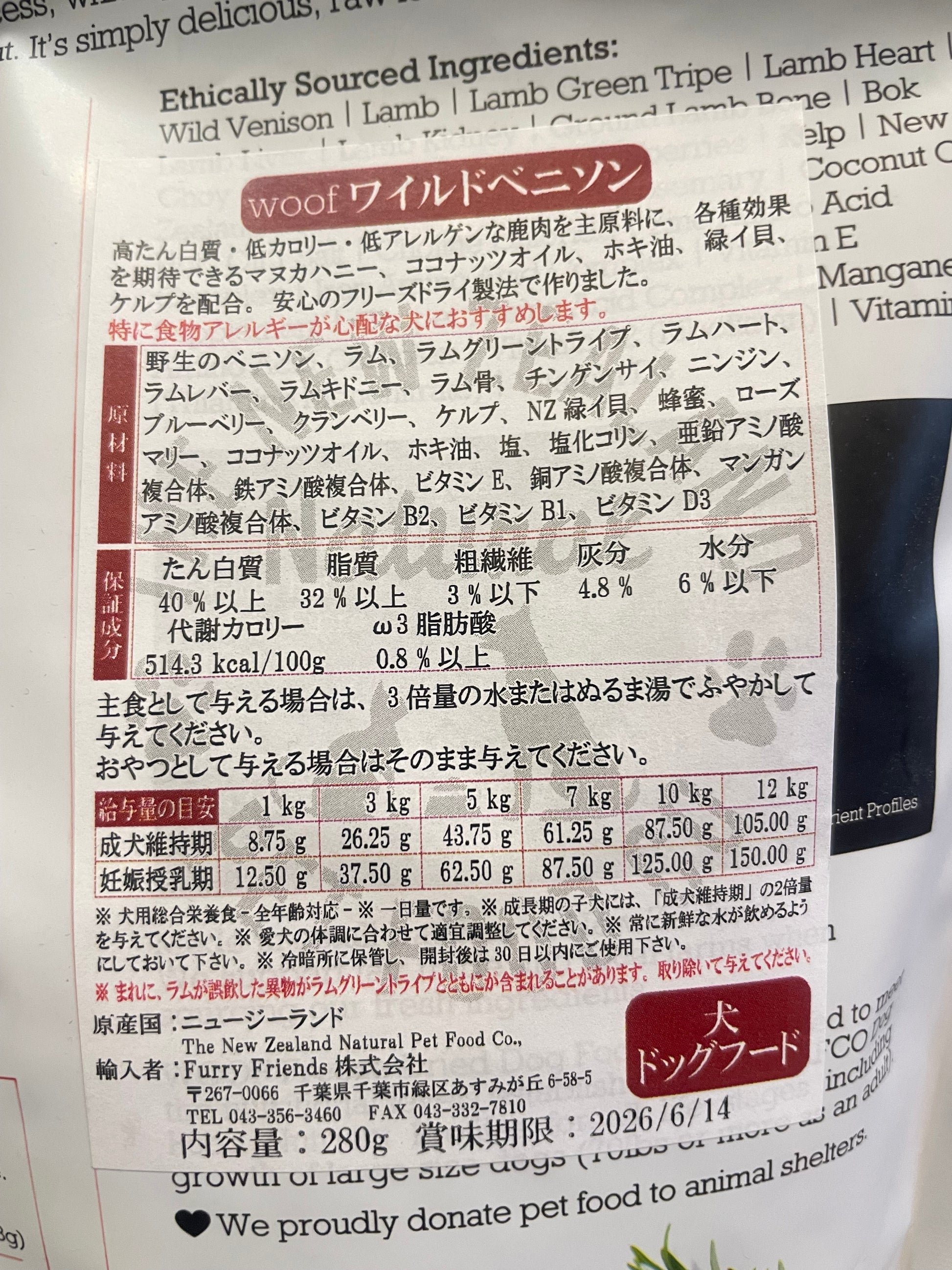 原材料:野生のベニソン、ラム、ラムグリーントライプ、ラムハート、ラムレバー、ラムキドニー、ラム骨、チンゲンサイ、ニンジン、ブルーベリー、クランベリー、ケルプ、NZ 緑イ貝、蜂蜜、ローズマリー、ココナッツオイル、ホキ油、塩、塩化コリン、亜鉛アミノ酸複合体、鉄アミノ酸複合体、ビタミン E、銅アミノ酸複合体、マンガンアミノ酸複合体、ビタミ ン B2、ビタミン B1、ビタミン D3