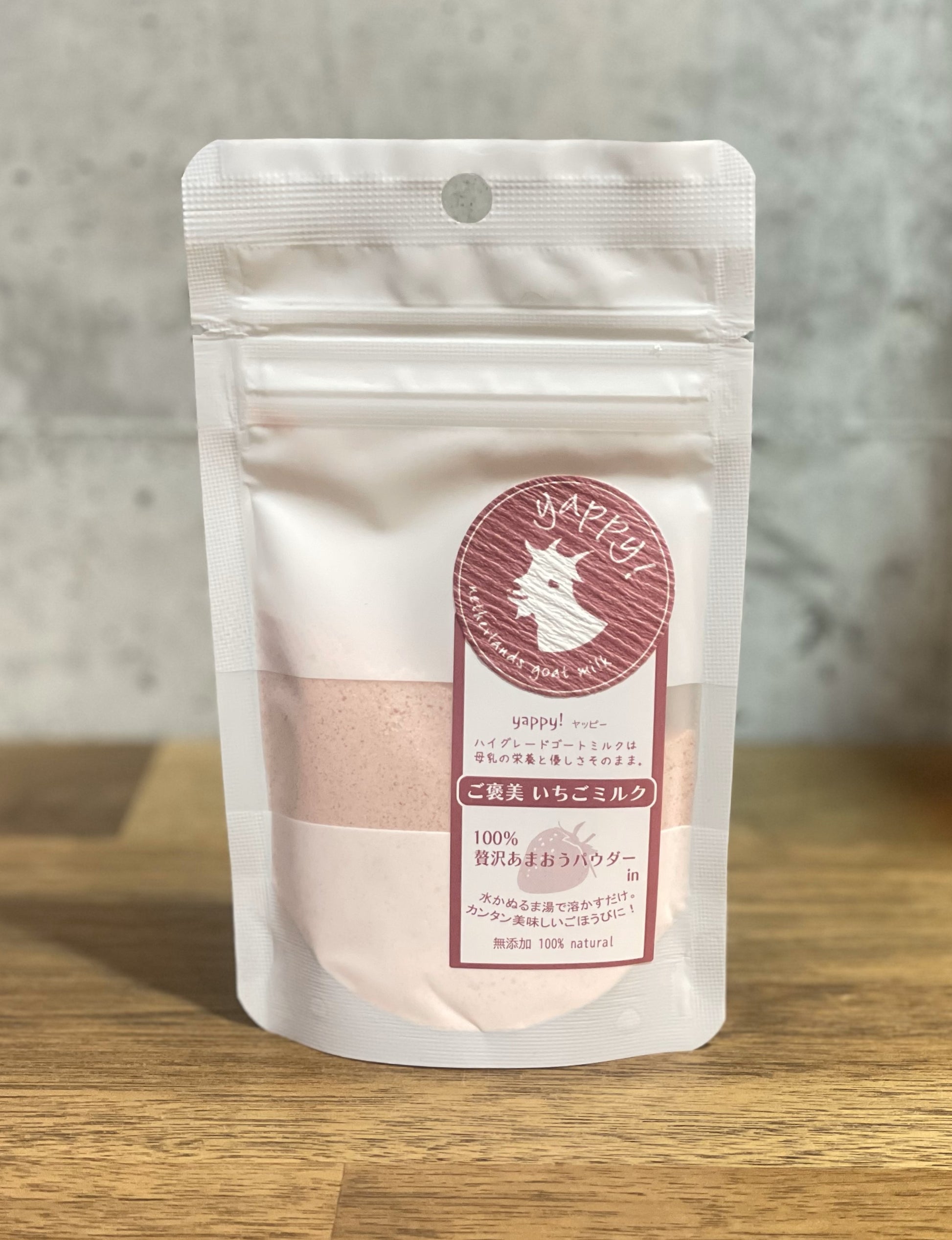 高栄養、高品質のヤギミルクに福岡県産の高級いちご、あまおうのフリーズドライパウダーをプラス!